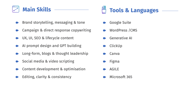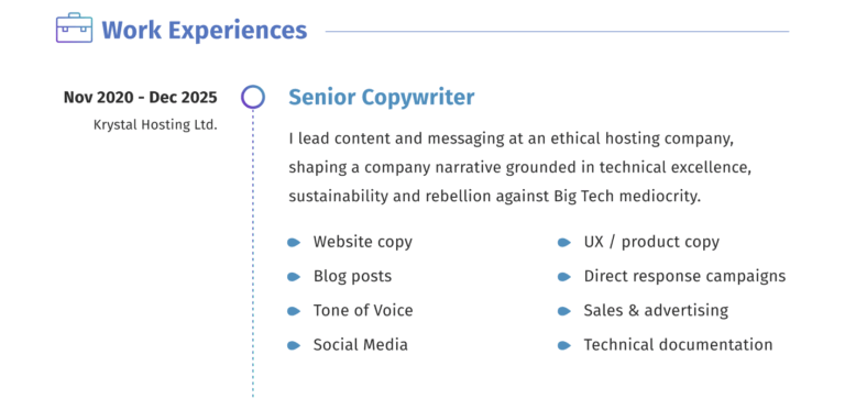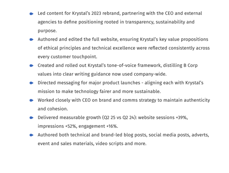 CV & Portfolio CV Selected Portfolio Krystal Hosting Blog posts. Technical, inspirational, informative and fun. Video scripts. Crafted for clarity and flow. Landing pages. Clear, compelling and built for conversion. Case Studies. Telling stories to demonstrate value and inspire action. Emails. Informative, inspiring and compelling. Social Media Posts. Exciting and witty, informative and smart. Crafted to build a following. blur Group Pay4 - Financial Services Just Journey Zalando Fashion HouseSimple eBay